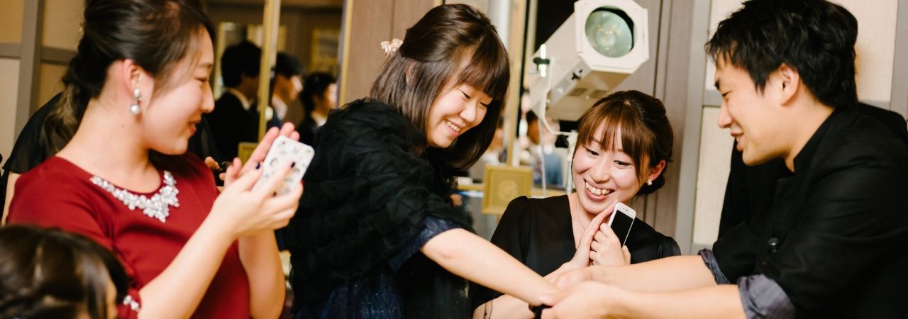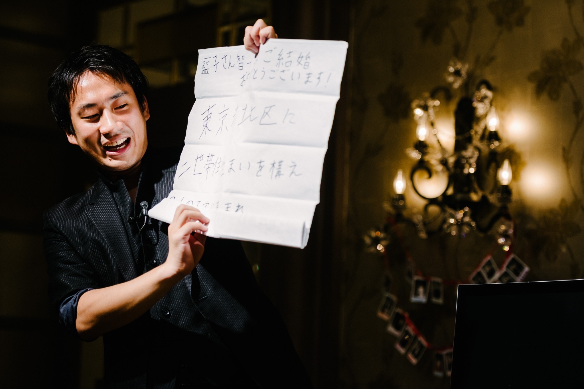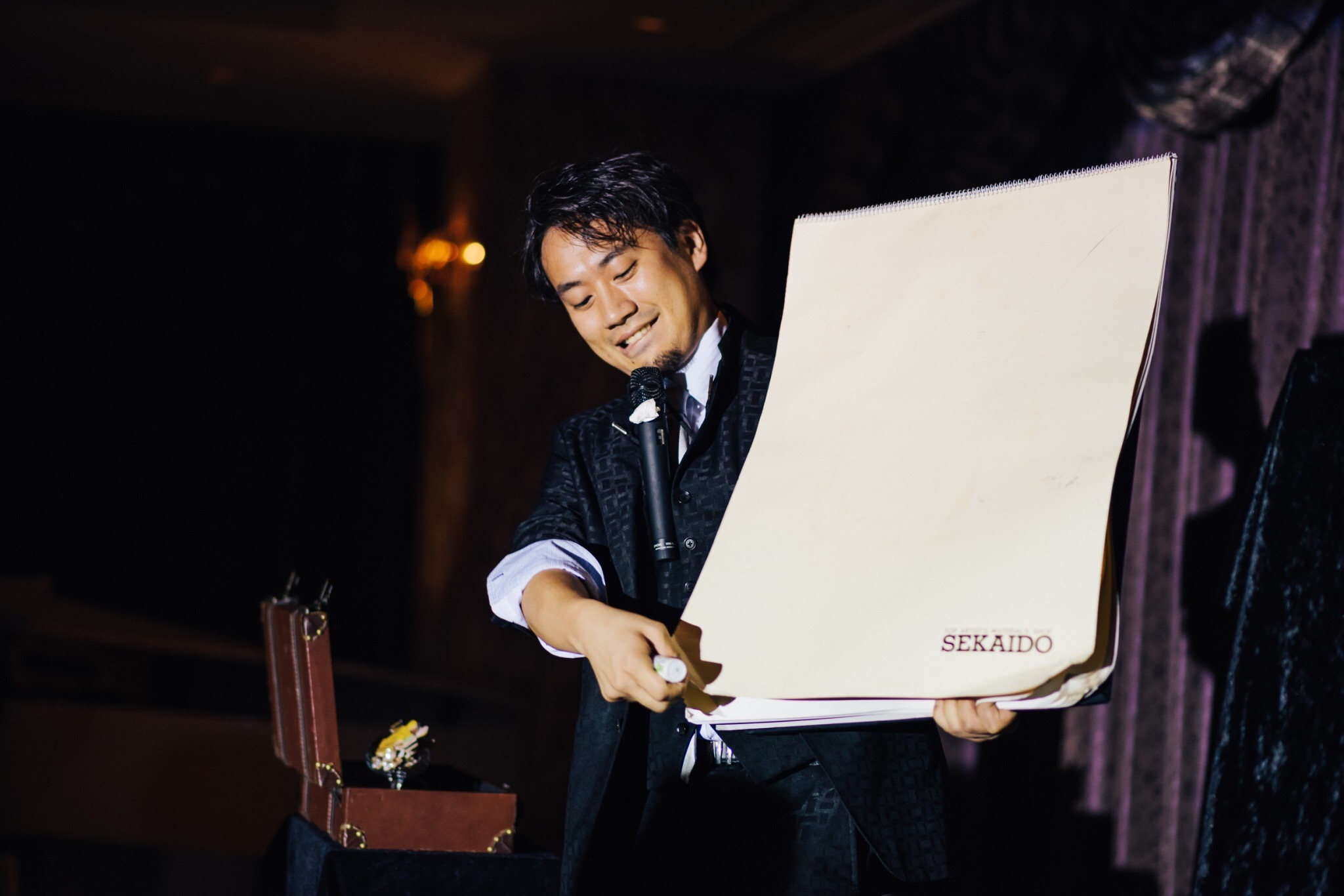 お二人をテーマにしたマジックや、お二人の名前を印刷した道具で行う全体参加型マジックなど、生の芸でしか味わえない臨場感でお楽しみいただけます。